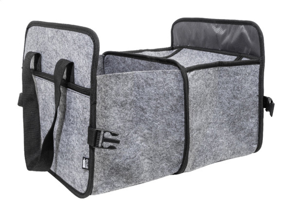 Foldable, RPET felt car boot organizer with zipped front pocket, long handles and side buckles for convenient storage. Includes one open storage compartment and one zipped cooler compartment with aluminium padding. With distinctive RPET label.