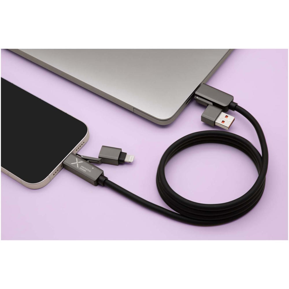 Ultra fast 100W magnetic charging cable that powers smartphones, tablets, and laptops. The 1-metre flat cable features Type-C and Lightning connectors, cords made from recycled silicone, and durable zinc alloy end caps. With dual USB-A and USB-C input, it ensures 100% compatibility with the latest computer models. Fully compatible with Apple CarPlay and Android Auto. Customisation is available via laser engraving on the zinc end cap. Supplied in a recyclable TPU pouch with a recycled paper insert.