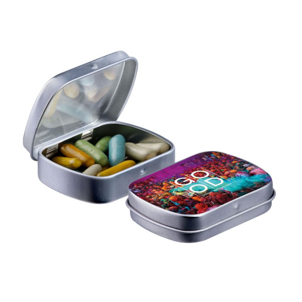 Mini white hinge tin with approx. 23 grams of Mini Choco's, printed in full color. Includes... more