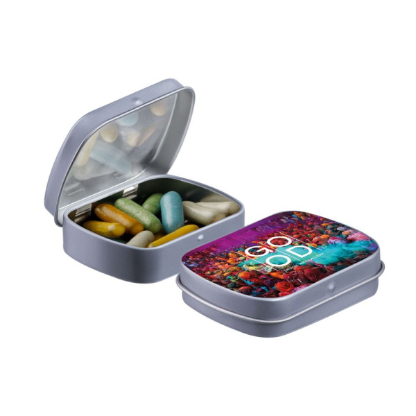 Mini white hinge tin with approx. 23 grams of Mini Choco's, printed in full color. Includes ingredient sticker and seal.