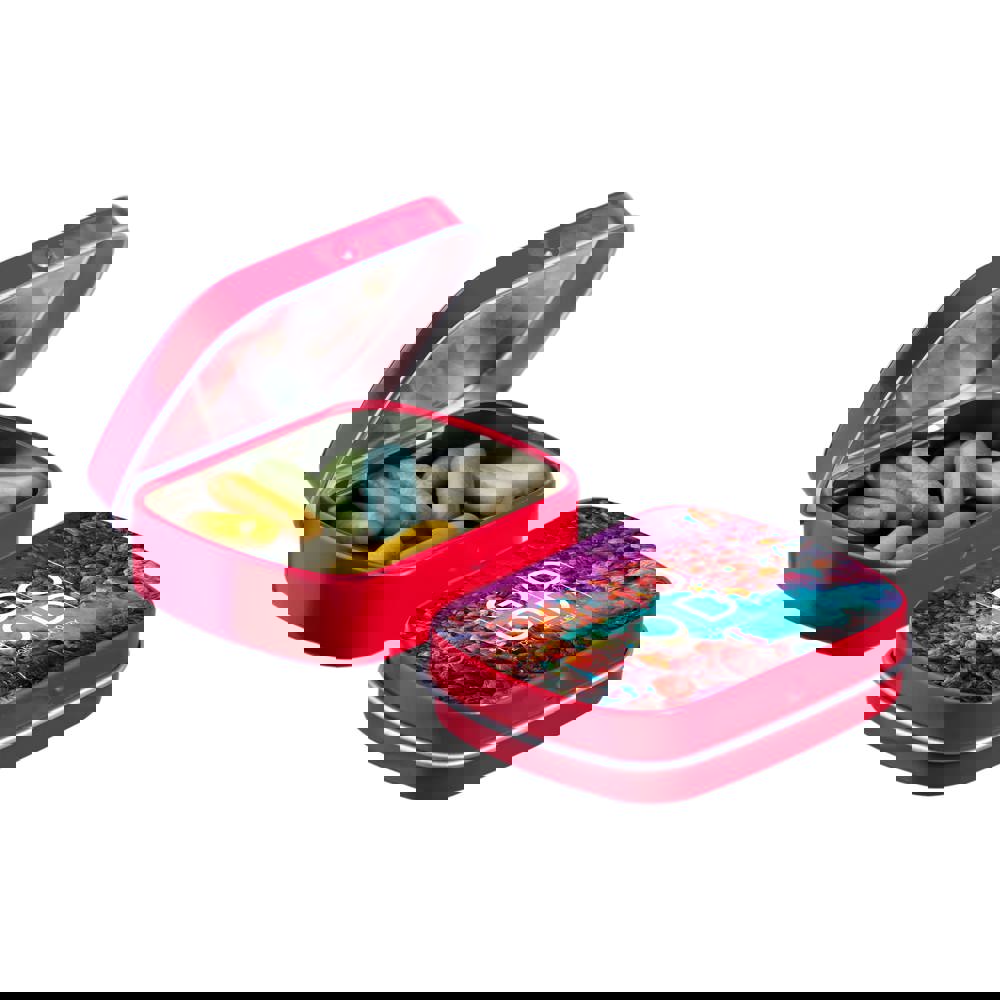 Mini white hinge tin with approx. 23 grams of Mini Choco's, printed in full color. Includes ingredient sticker and seal.