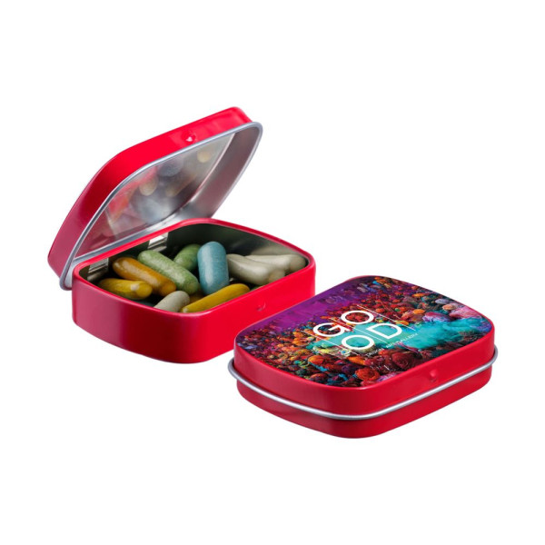 Mini white hinge tin with approx. 23 grams of Mini Choco's, printed in full color. Includes... more
