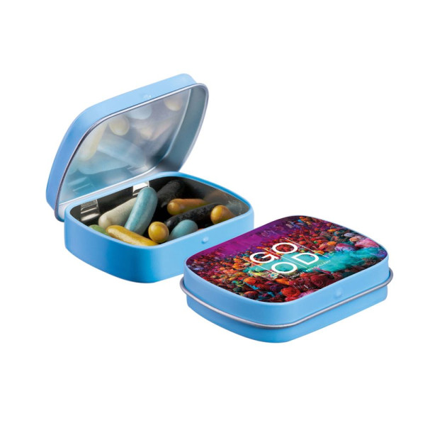 Mini white hinge tin with approx. 23 grams of Mini Choco's, printed in full color. Includes... more