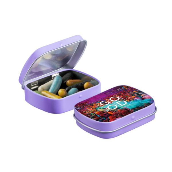 Mini white hinge tin with approx. 23 grams of Mini Choco's, printed in full color. Includes ingredient sticker and seal.
