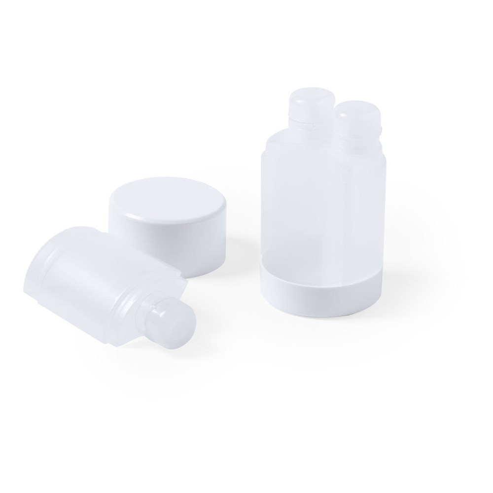 Travel set of 3 accessories in resistant PP material. Including 3 bottles with watertight closure. Presented in an eye catching case.