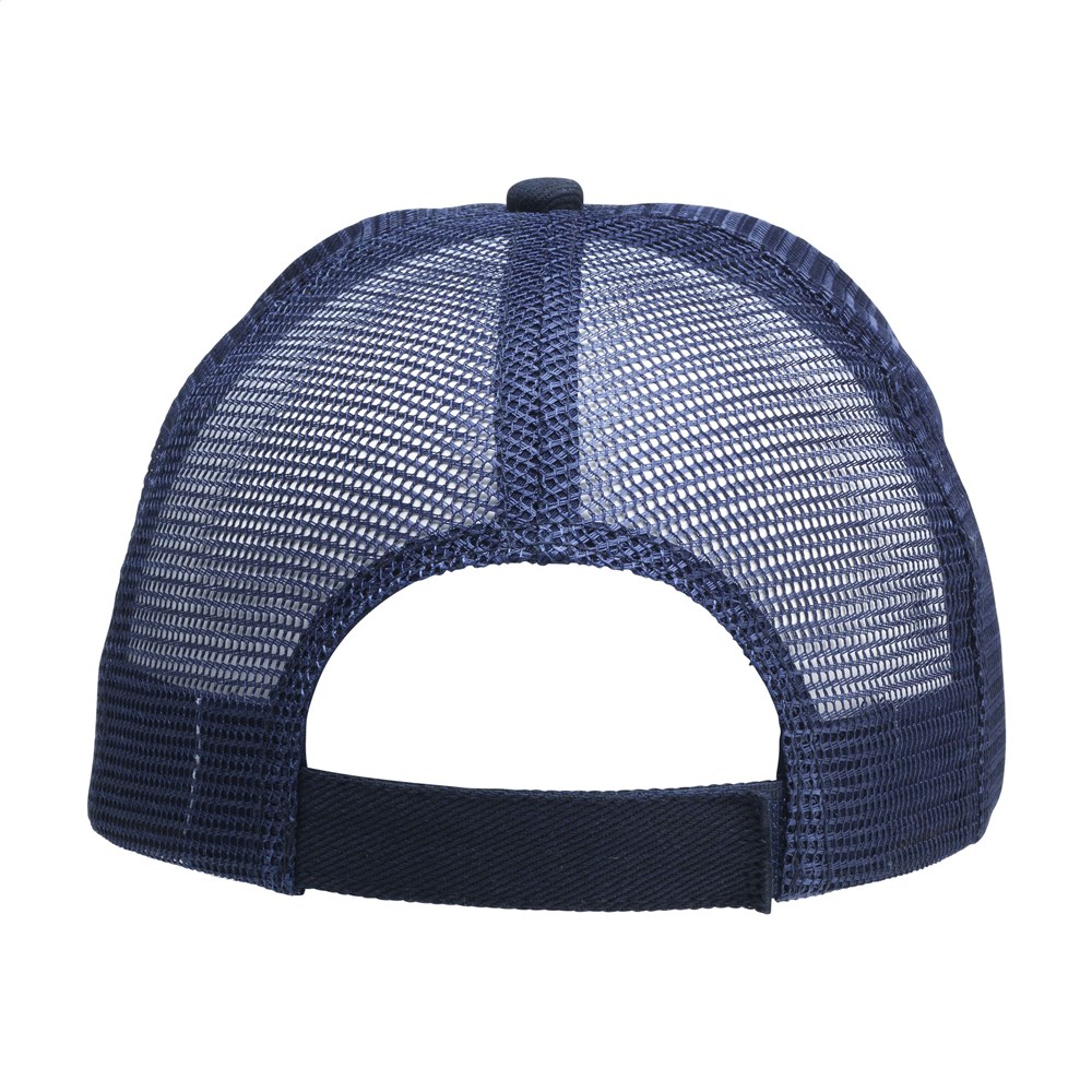 5-panel trucker cap with a contoured curved peak made from 60% brushed recycled cotton and 40% recycled polyester. The rear of this cap has a mesh structure (polyester) for optimal ventilation. Velcro closure for easy adjustment.