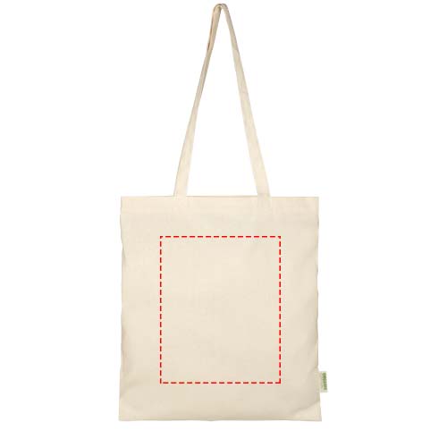 Tote bag made from 100% OCS certified 100 g/m² organic cotton originating from India, featuring a large open main compartment providing plenty of space to carry around all of the essentials. The 32 cm long handles makes it comfortable and easy to carry around wherever you go. Resistance up to 5 kg weight. Volume capacity: 7 litres.