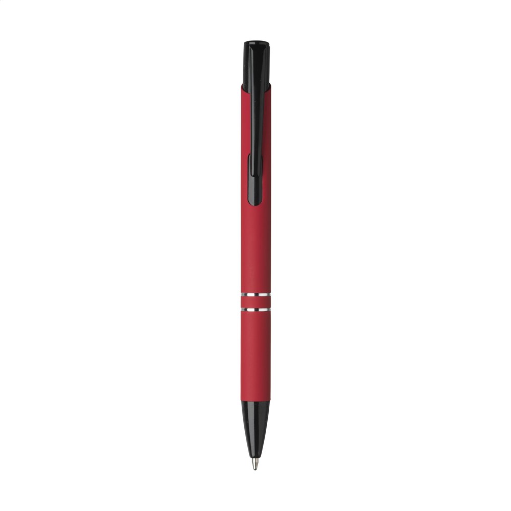 Blue ink ballpoint pen with black painted push button/clip and tip, chrome interlaces. The barrel is finished with a rubberised finish.