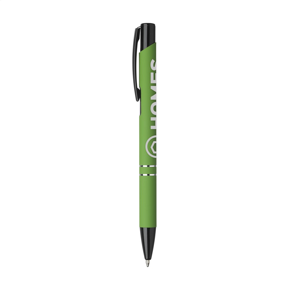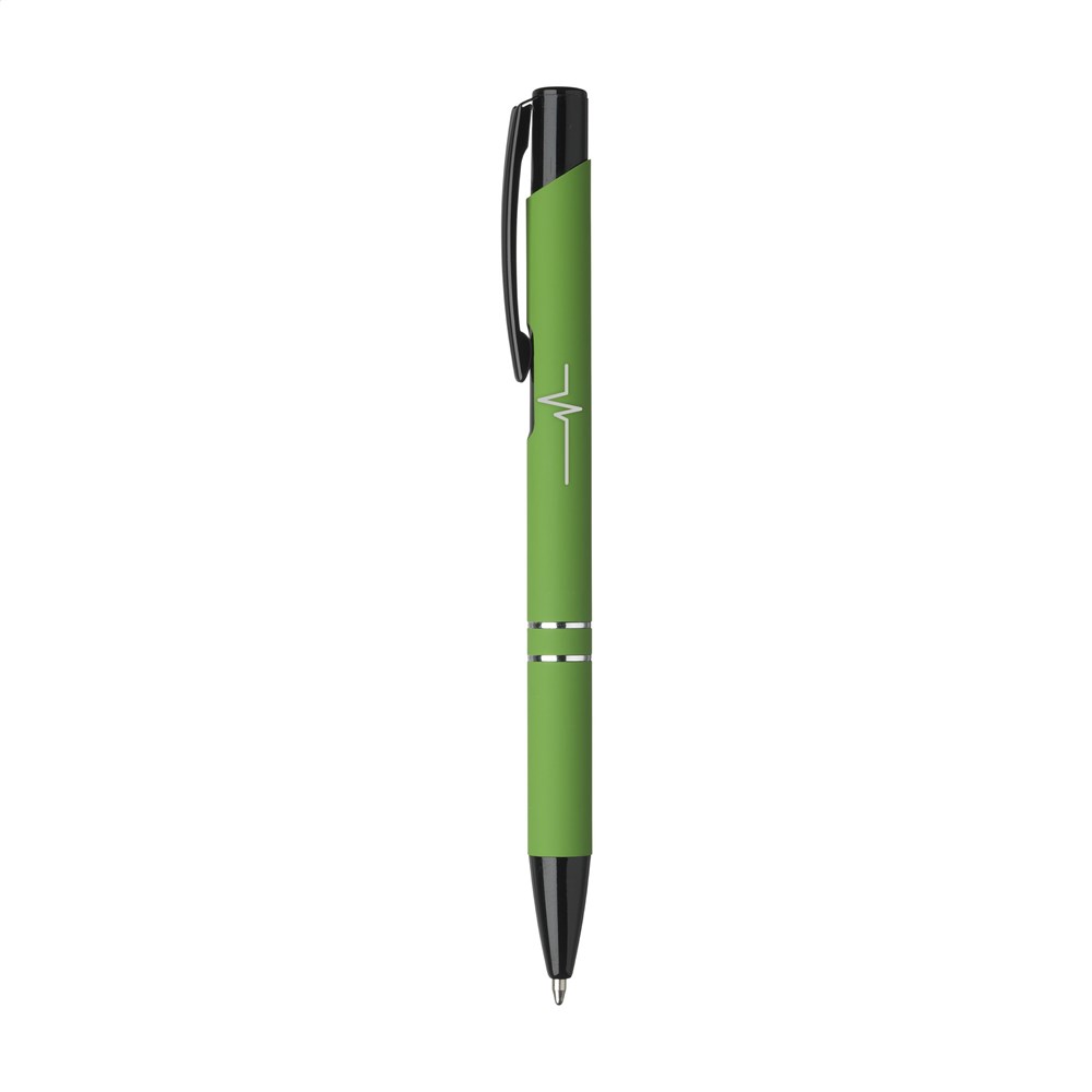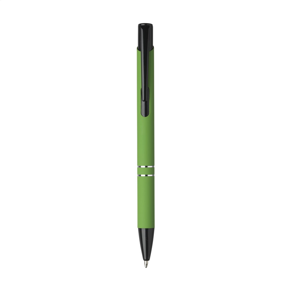 Blue ink ballpoint pen with black painted push button/clip and tip, chrome interlaces. The barrel is finished with a rubberised finish.