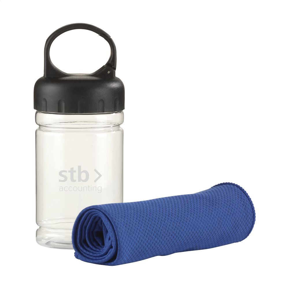 Special cooling towel made from 100% polyester. After immersing in cold water, this towel is an effective cooling instrument and a deterrent to sunburn. Size 30 x 80 cm. Ideal to wear as a neck cooler. Comes in a transparant case with ABS screw cap with carabiner hook.