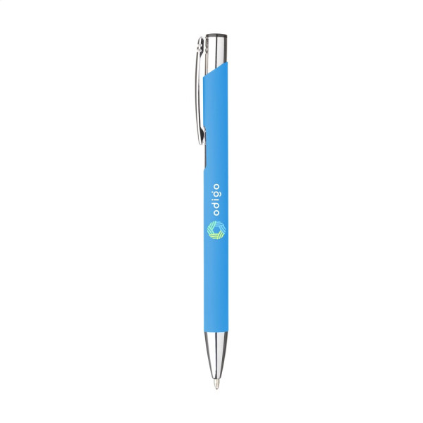 Aluminium ballpoint pen with metal clip and blue ink. The barrel is covered with an attractive rubberised coating. The barrel provides a large print area for text or a logo.