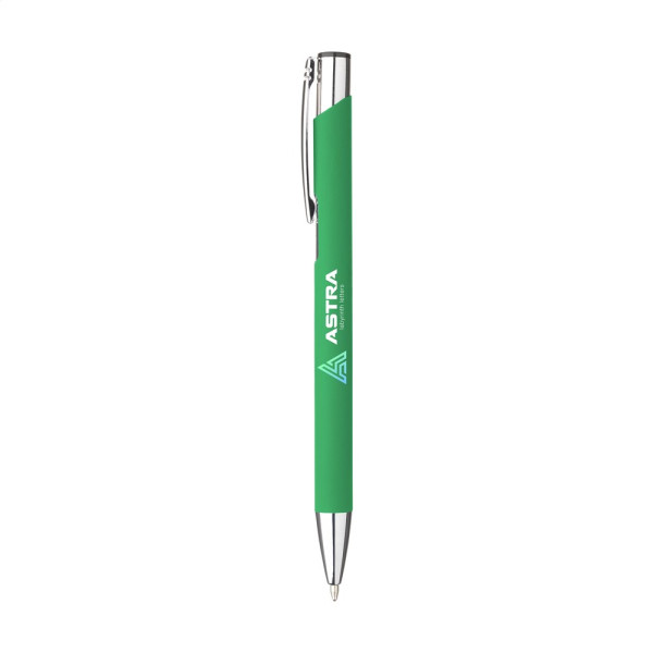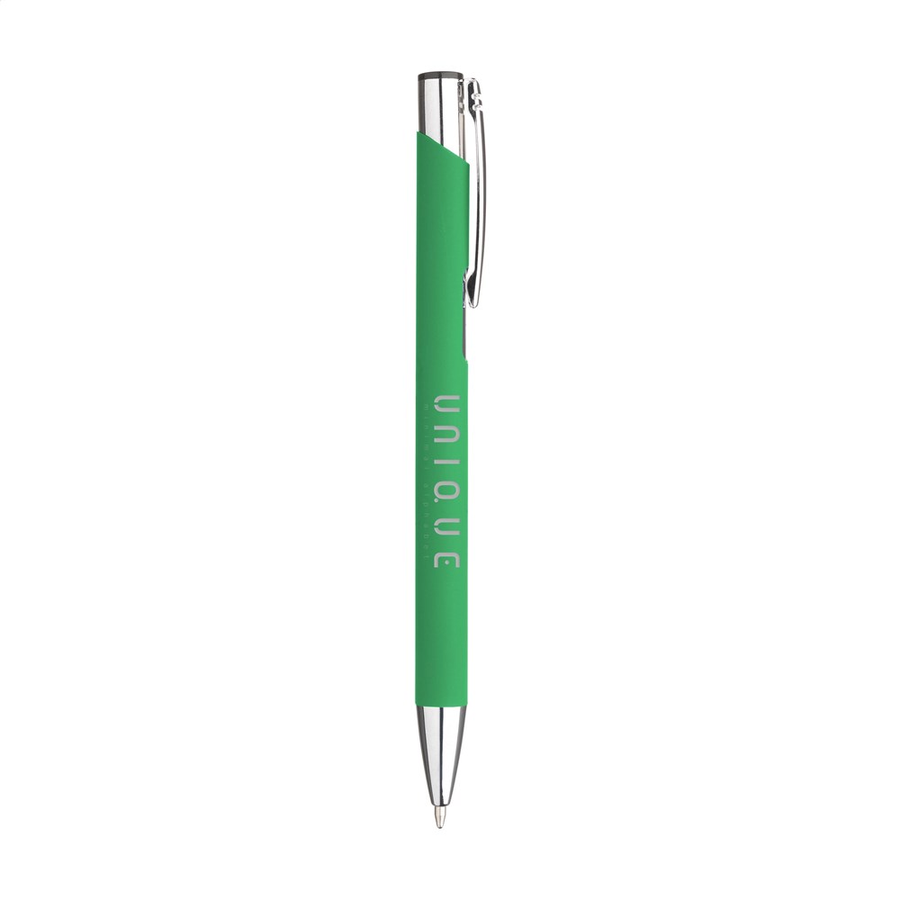 Aluminium ballpoint pen with metal clip and blue ink. The barrel is covered with an attractive rubberised coating. The barrel provides a large print area for text or a logo.