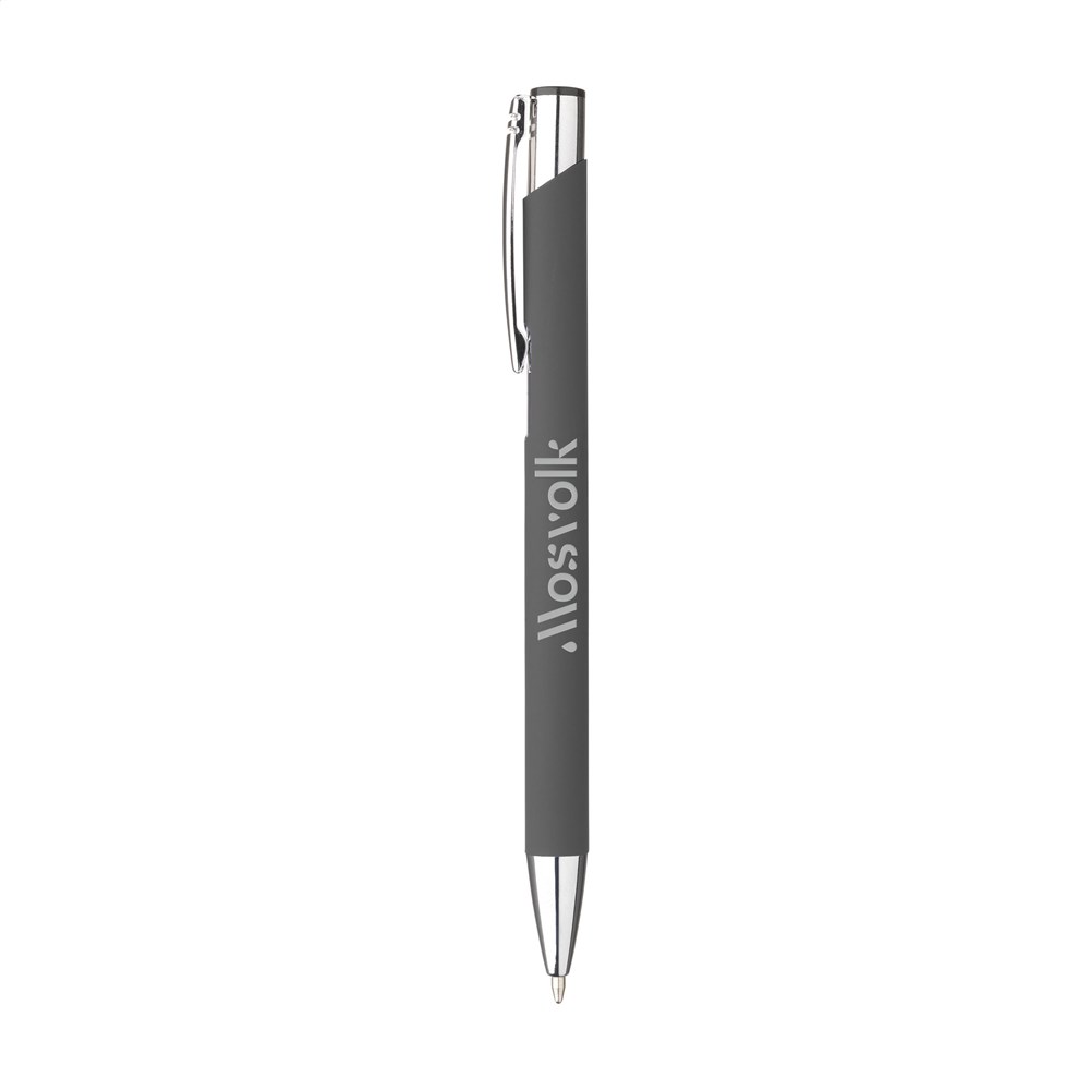 Aluminium ballpoint pen with metal clip and blue ink. The barrel is covered with an attractive rubberised coating. The barrel provides a large print area for text or a logo.