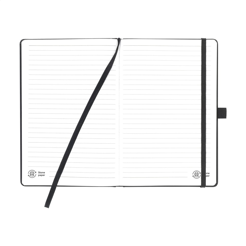 This A5-sized notebook is made from tree-free paper with approximately 64 sheets/128 pages of (170 gsm) cream-coloured lined paper. The paper is made from natural stone: 80% calcium carbonate and 20% resin (HDPE) to bind the stone. The cover is also made from 950 grams of stone paper with a Thermo PU finish. This booklet features a handy pen loop, elastic closure and reading ribbon. Stone paper is an alternative to ordinary paper because far fewer resources are used in production: no trees, no water, no bleach and no chemicals. In addition to the beautiful smooth paper, it can also be infinitely recycled. The paper is anti-bacterial, waterproof, and tear and stain-resistant.