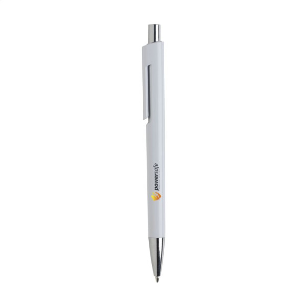 Blue ink ballpoint pen with unique design: the barrel and clip of this pen is designed in one piece. With striking silver accent below the optical 'floating' clip.