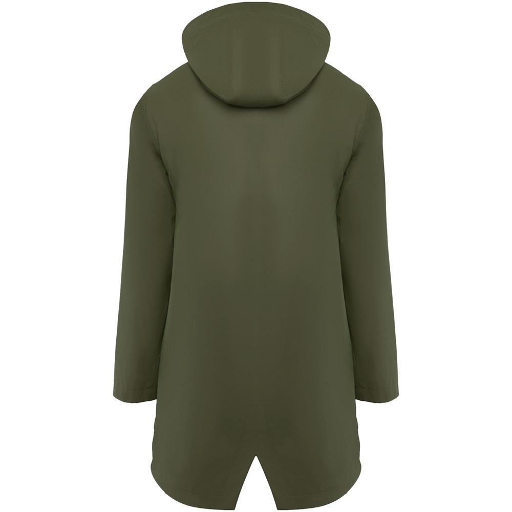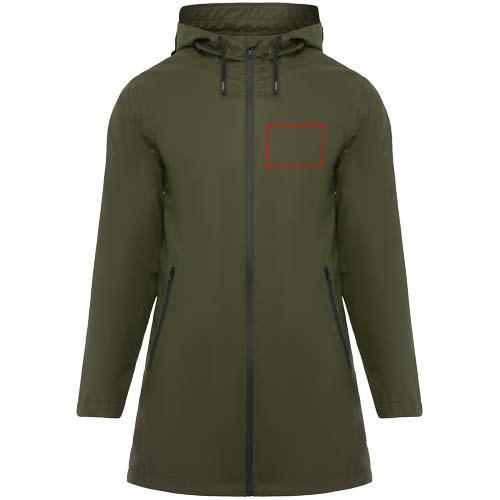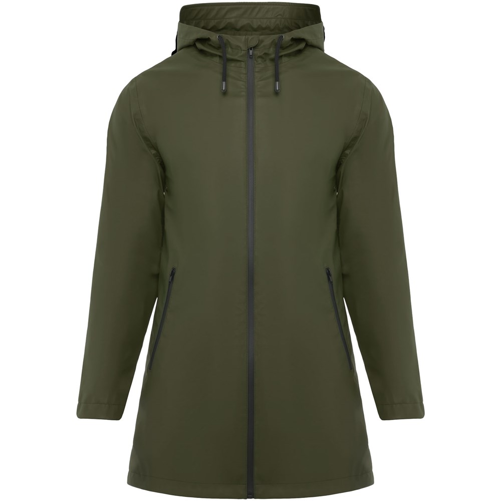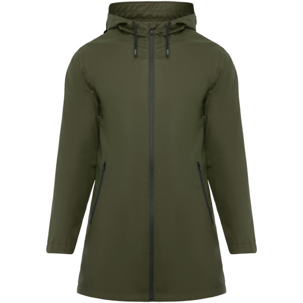 Waterproof raincoat for women. Hood with peak. Heat-sealed zips and seams. Contrasting details in black. Two side pockets with zip. Slit on back hem. Removable label. Waterproof. The model is 179 cm and is wearing size S.