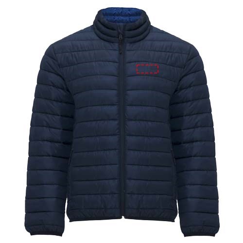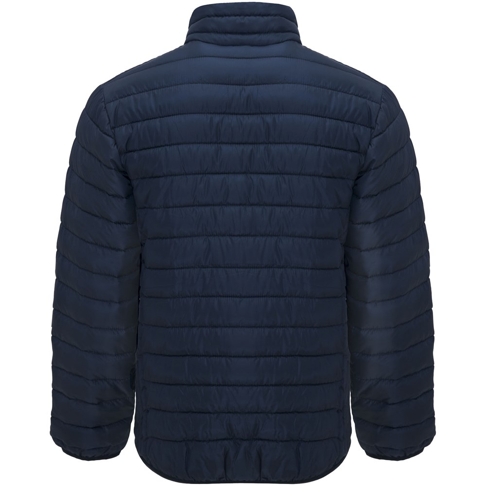 Men's quilted jacket with feather touch padding. Inverted zippers with matching chin protector and puller. Two front pockets with zippers. Matching elastic edging in collar, cuffs and hem. Contrasting inner lining. Includes stow carry bag. Lightweight and foldable garment. Removable label. Water resistant. Wind-proof. The model is 184 cm and is wearing size L.
