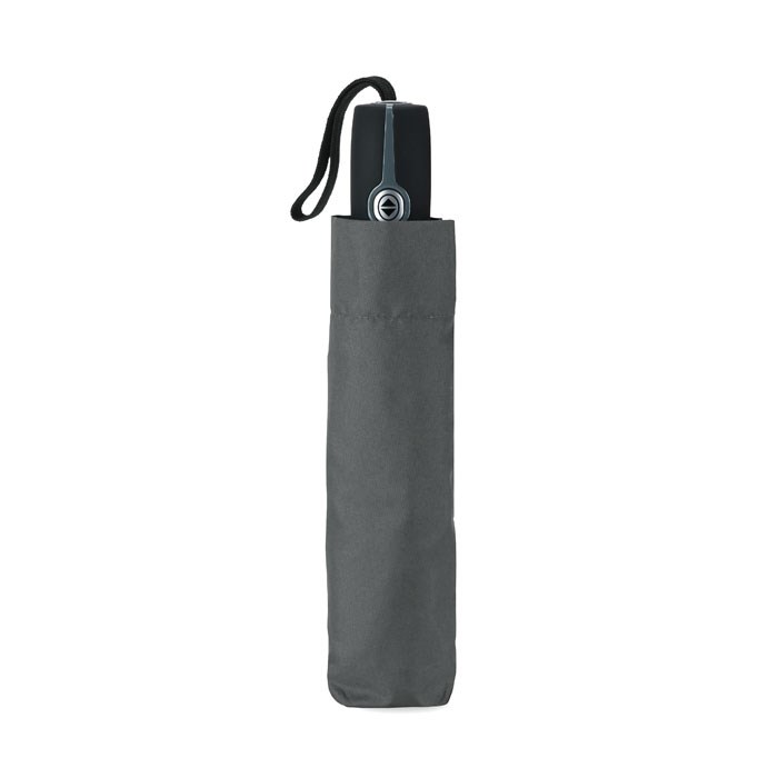 21 Inch Luxe 3 fold automatic windproof umbrella in 190T pongee with zinc plated steel shaft, black ribs with 2 sections fiberglass and chrome metal tips , black rubberised handle with doming. Includes matching pouch. Auto closure.