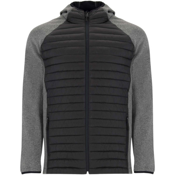 Unisex jacket in two-fabric combination: Fixed adjusted hood. Raglan sleeves. Sleeves, side panels and hood in softshell fabric. Quilted feather touch fabric in front and back. Inverted zip with matching chin protector and puller. Two front pockets with zippers. Matching elastic trim in collar, cuffs and hem. Removable label. Wind-proof model. The male model is 184 cm and is wearing size L, and the female model is 179 cm and is wearing size S.