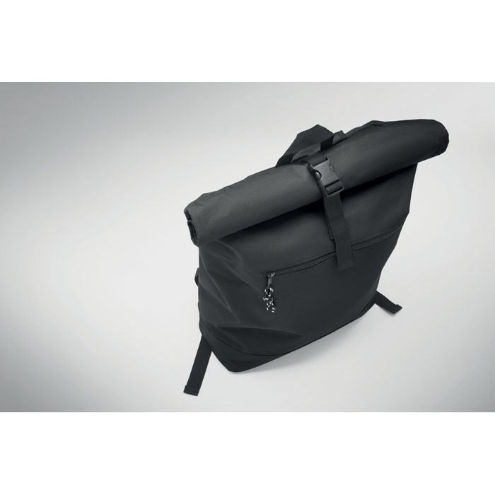 15 inch rolltop laptop backpack in 600D polyester with padded back and base reinforcement. Zippered front pocket. 210D lining.