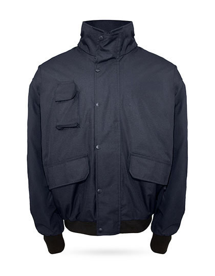 Pilot jacket with detachable hood in the collar, adjustable cord, patch mobile phone pocket on the chest, two outer pockets with flaps | Optimal weather protection thanks to welded seams and concealed front zip with press stud placket | Finishing options for individual customisation | Waterproof and windproof outer material with warm quilted lining | Breathable and durable, ideal for changeable weather conditions and professional use | Tested in accordance with EN 343:2019 | Individually packed in polybags and equipped with barcodes