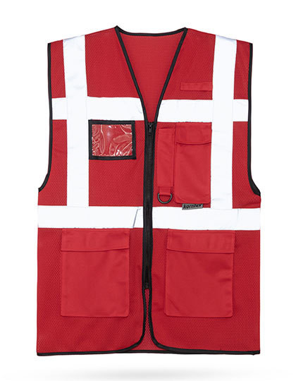 Multifunctional mesh high-visibility vest with zip fastening and pockets | Comfortable even at high temperatures thanks to mesh fabric and a loose fit | Two reflective stripes around the body and over the shoulders, each 5 cm wide, for good visibility | Featuring various pockets and a D-ring | Certified according to EN ISO 20471