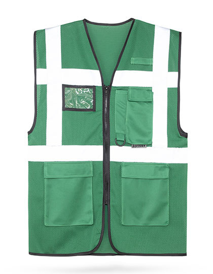 Multifunctional mesh high-visibility vest with zip fastening and pockets | Comfortable even at high temperatures thanks to mesh fabric and a loose fit | Two reflective stripes around the body and over the shoulders, each 5 cm wide, for good visibility | Featuring various pockets and a D-ring | Certified according to EN ISO 20471