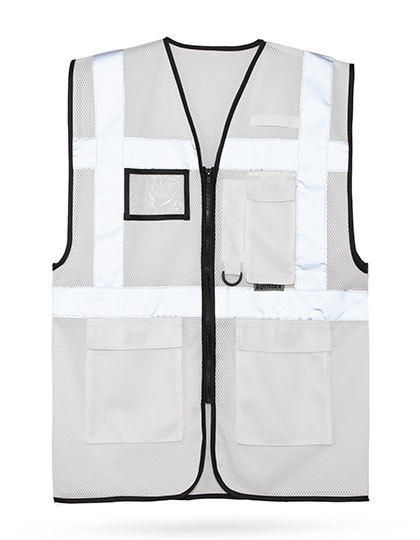 Multifunctional mesh high-visibility vest with zip fastening and pockets | Comfortable even at high temperatures thanks to mesh fabric and a loose fit | Two reflective stripes around the body and over the shoulders, each 5 cm wide, for good visibility | Featuring various pockets and a D-ring | Certified according to EN ISO 20471