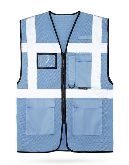 Multifunctional mesh high-visibility vest with zip fastening and pockets | Comfortable even at high temperatures thanks to mesh fabric and a loose fit | Two reflective stripes around the body and over the shoulders, each 5 cm wide, for good visibility | Featuring various pockets and a D-ring | Certified according to EN ISO 20471