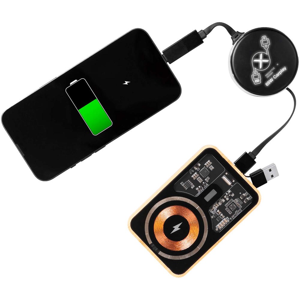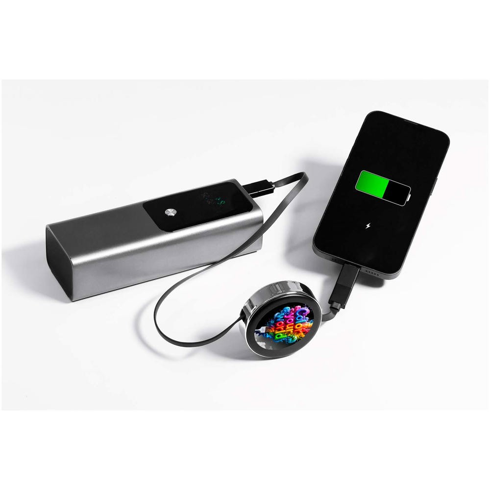 4-in-1 retractable 65W charging cable with dual USB-A + USB-C input and Type-C, Lightning and Micro-USB connectors to power all your devices from one cable. The retractable design keeps it neat, tangle-free and easy to store for travel or everyday use. Customise one side with a luminous LED logo or an offset printed logo for a modern, high-impact brand display. Supplied in a recyclable TPU pouch with a recycled paper insert.