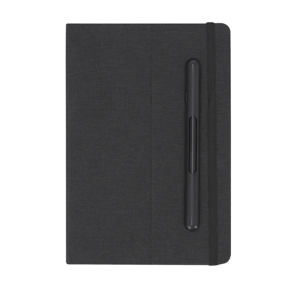 Notepad stand with rigid covers made of 600D RPET. Versatile support integrated into the cover. Includes eternal pencil pen. Contains 96 inner sheets available with a stripe. It has an elastic closure. With RPET logo.