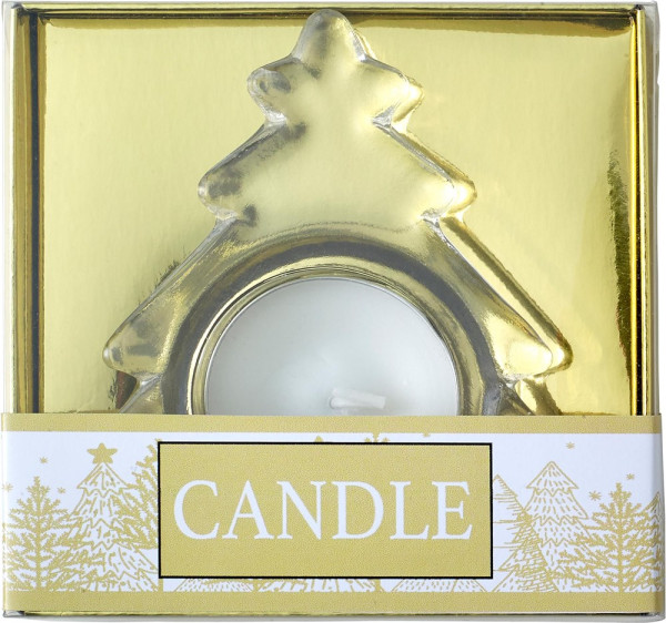 Glass holder in the shape of a Christmas tree, including tealight. Presented in a gift box.
