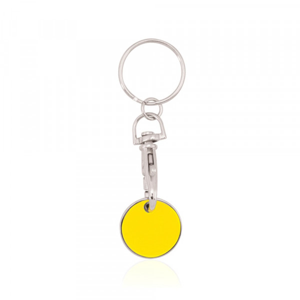 Metallic keychain coin in fun design in varied colors with removable coin and closure carabiner.