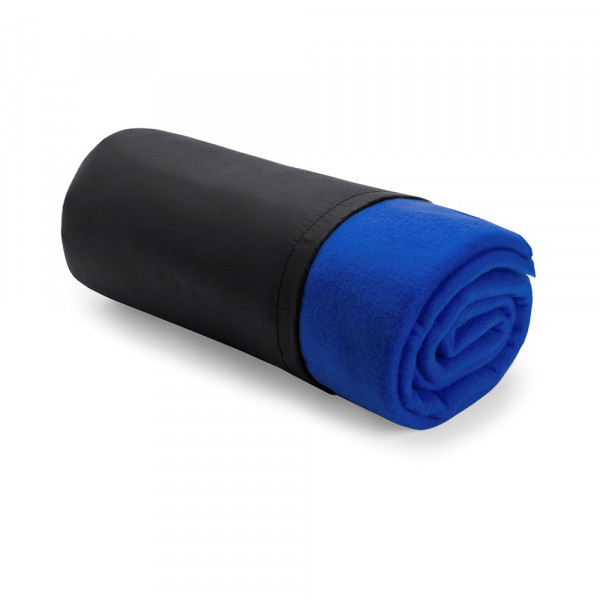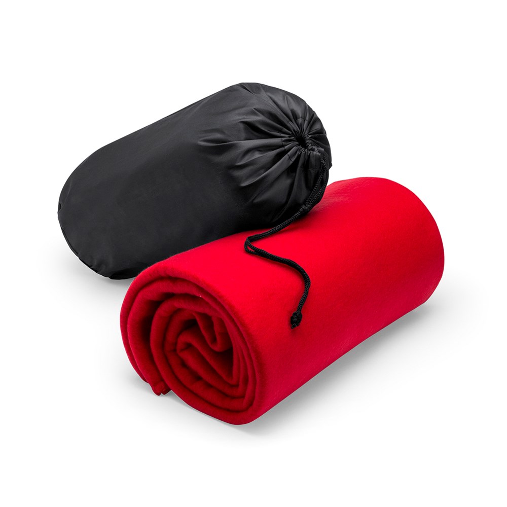 Blanket of 120x150cm in a varied range of bright tones. In polar fleece material of 180g/m2 with anti-pilling treatment and with a soft polyester, string closure sleeve.