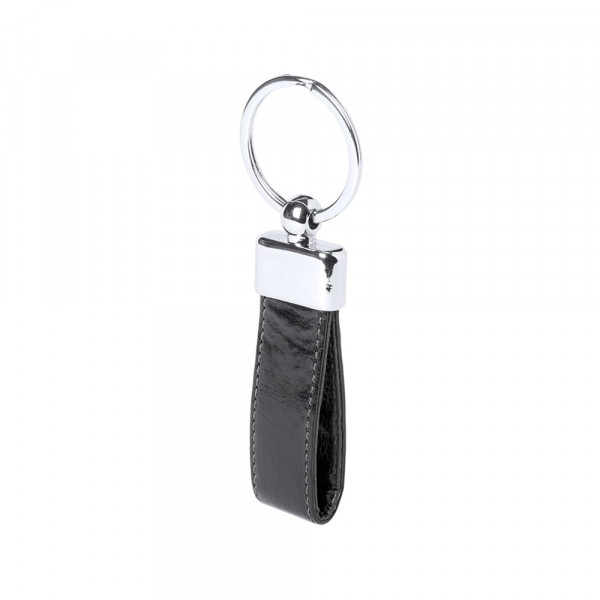 Keychain in elegant bicolor PU leather finish with metallic accessory. Presented in an individual die-cut case.