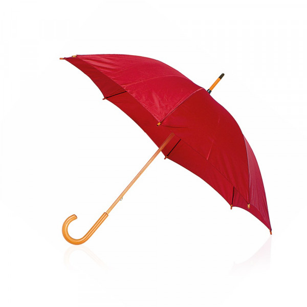8-panel umbrella made of polyester. 105cm in diameter, with manual opening, black metallic ribs and Velcro fastening. Pole and handle in soft wooden natural colour finishing, with fabric available in a wide range of bright colours.