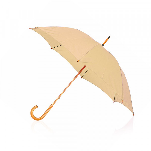 8-panel umbrella made of polyester. 105cm in diameter, with manual opening, black metallic ribs and Velcro fastening. Pole and handle in soft wooden natural colour finishing, with fabric available in a wide range of bright colours.