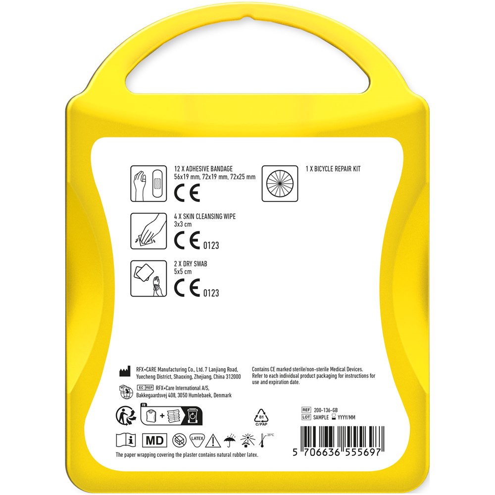 Ideal kit for every bike ride. Be prepared in the case of small injuries and flat tyres. Contents: 12 wash proof plasters, 4 skin cleansing swabs, 2 dry swabs, 1 repair kit. All of the first aid and care products within the kit meet all applicable EU regulations. Price includes full colour print.
