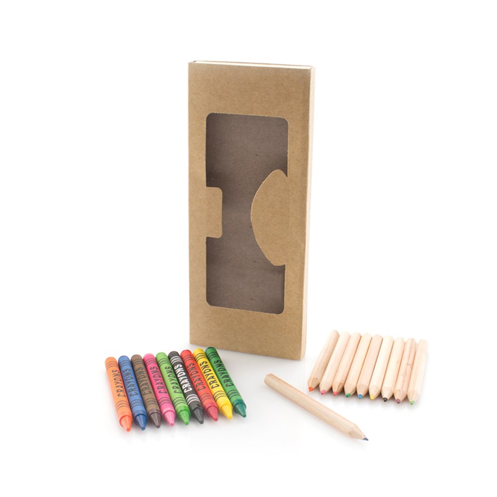 Set of 19 pieces in natural cardboard case with window and inside tray. Contains cylindrical body crayons and natural wood pencils of hexagonal body in varied colors.