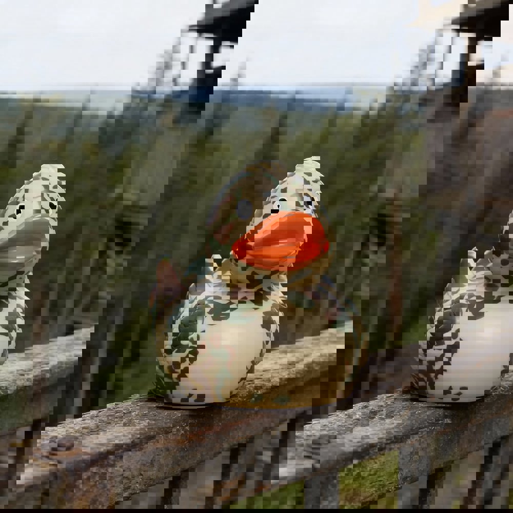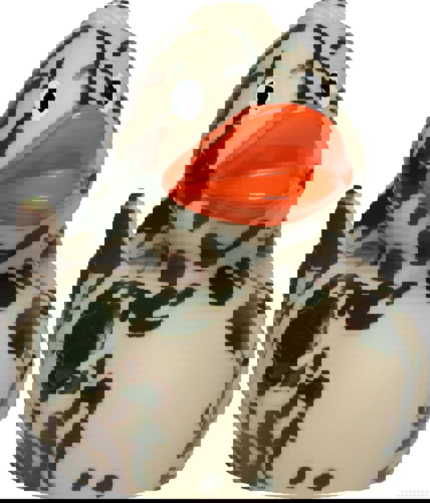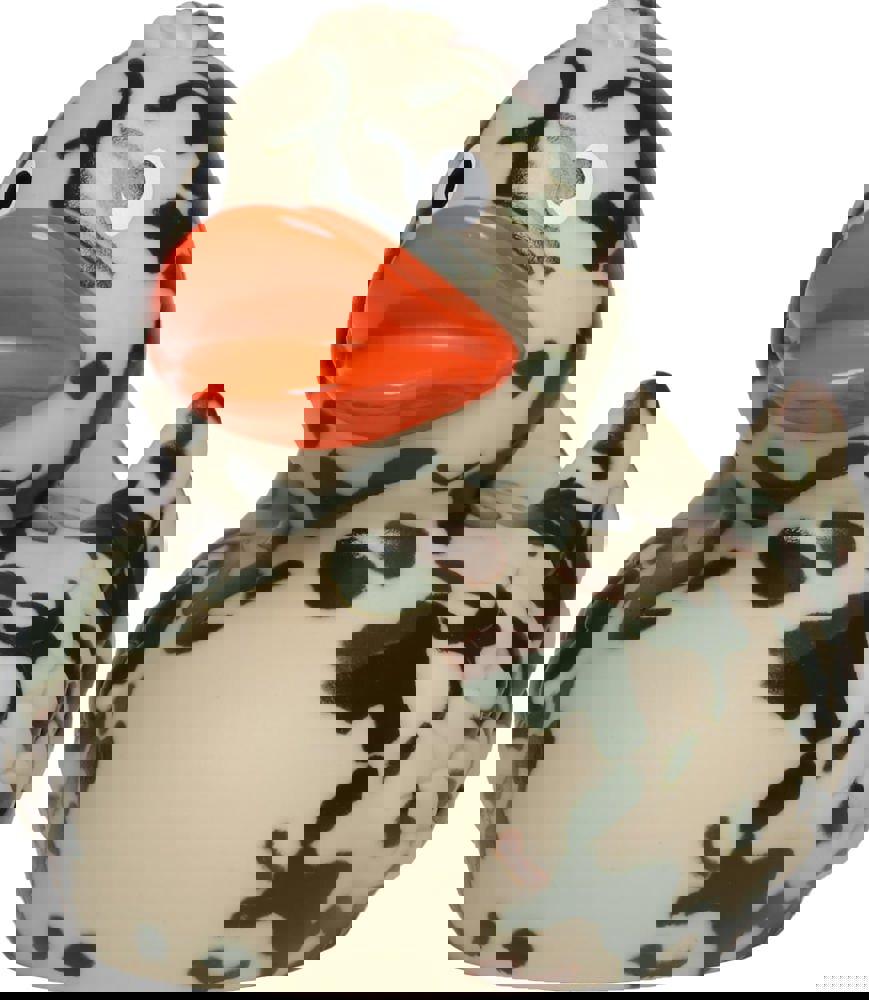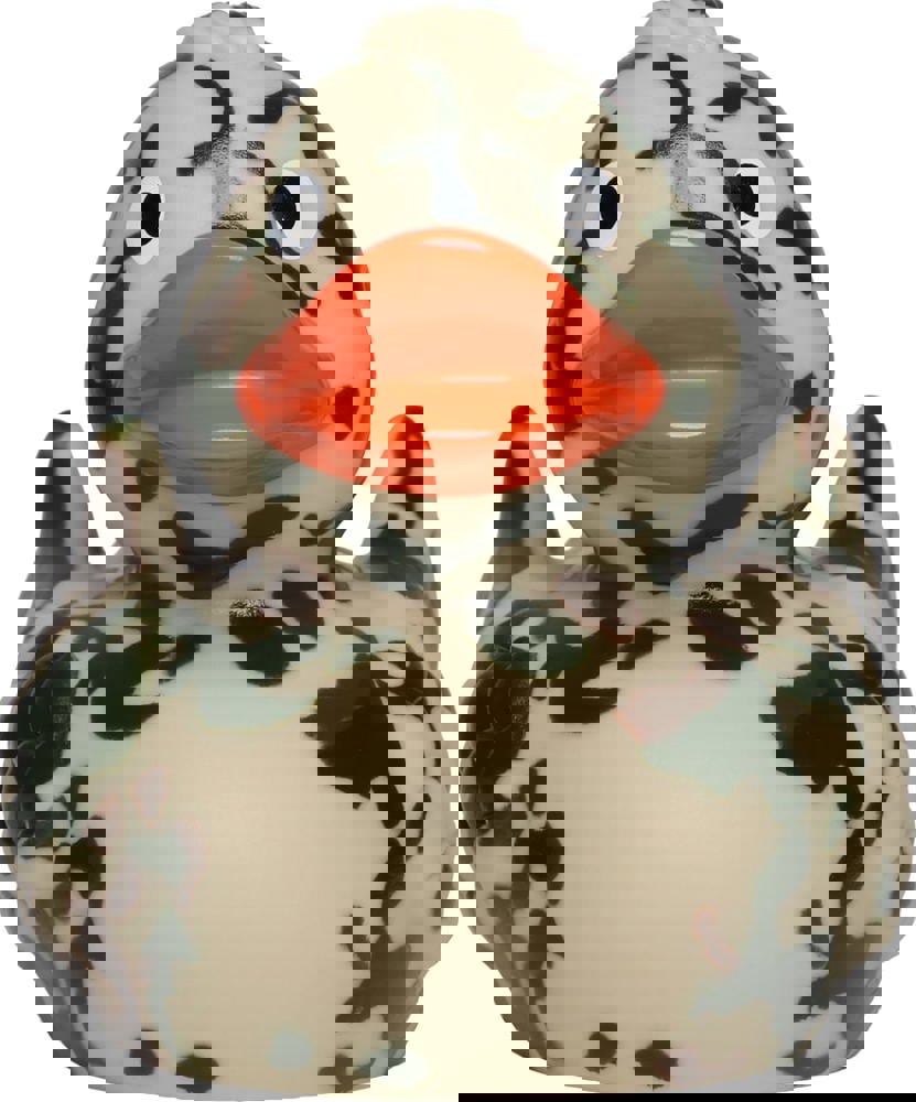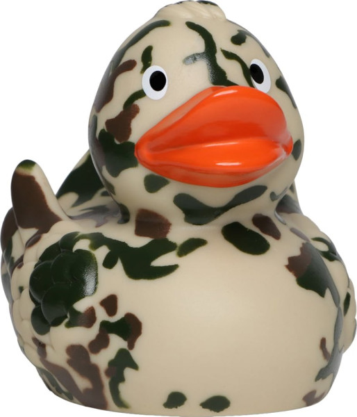 Here's a duckling in a secret mission. In order not to be seen immediately, it has skillfully wrapped its bright yellow plumage with a camouflage pattern and opaque colours. What's the secret mission? Make people smile. We say: She will easily succeed.