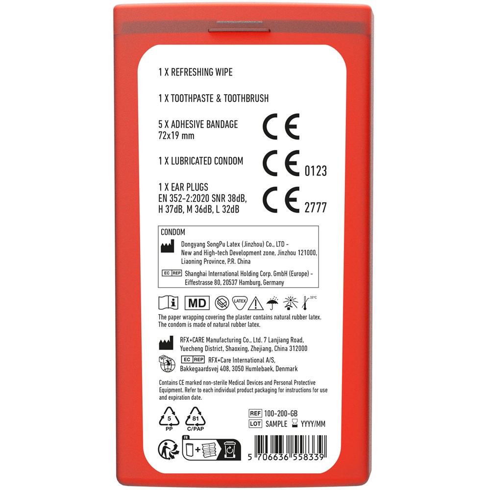 This is the ideal travel set for festivals and contains all the things needed for an overnight stay at a festival or party. The size of this kit allows you to easily store it in your bag or pocket. Contents: 1 toothbrush, 1 toothpaste, 1 earplugs, 1 antibacterial gel, 5 wash proof plasters, 1 condom. All of the first aid and care products within the kit meet all applicable EU regulations. Price includes full colour print.