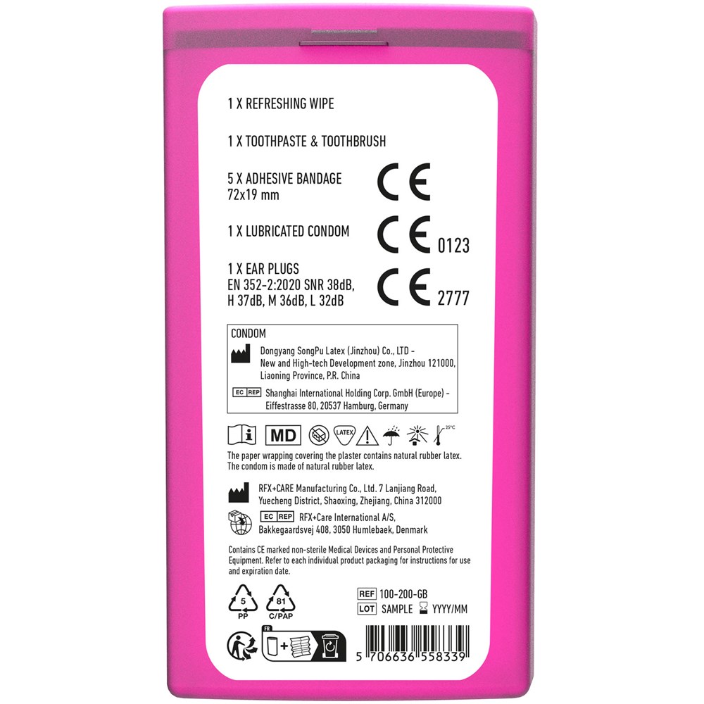 This is the ideal travel set for festivals and contains all the things needed for an overnight stay at a festival or party. The size of this kit allows you to easily store it in your bag or pocket. Contents: 1 toothbrush, 1 toothpaste, 1 earplugs, 1 antibacterial gel, 5 wash proof plasters, 1 condom. All of the first aid and care products within the kit meet all applicable EU regulations. Price includes full colour print.
