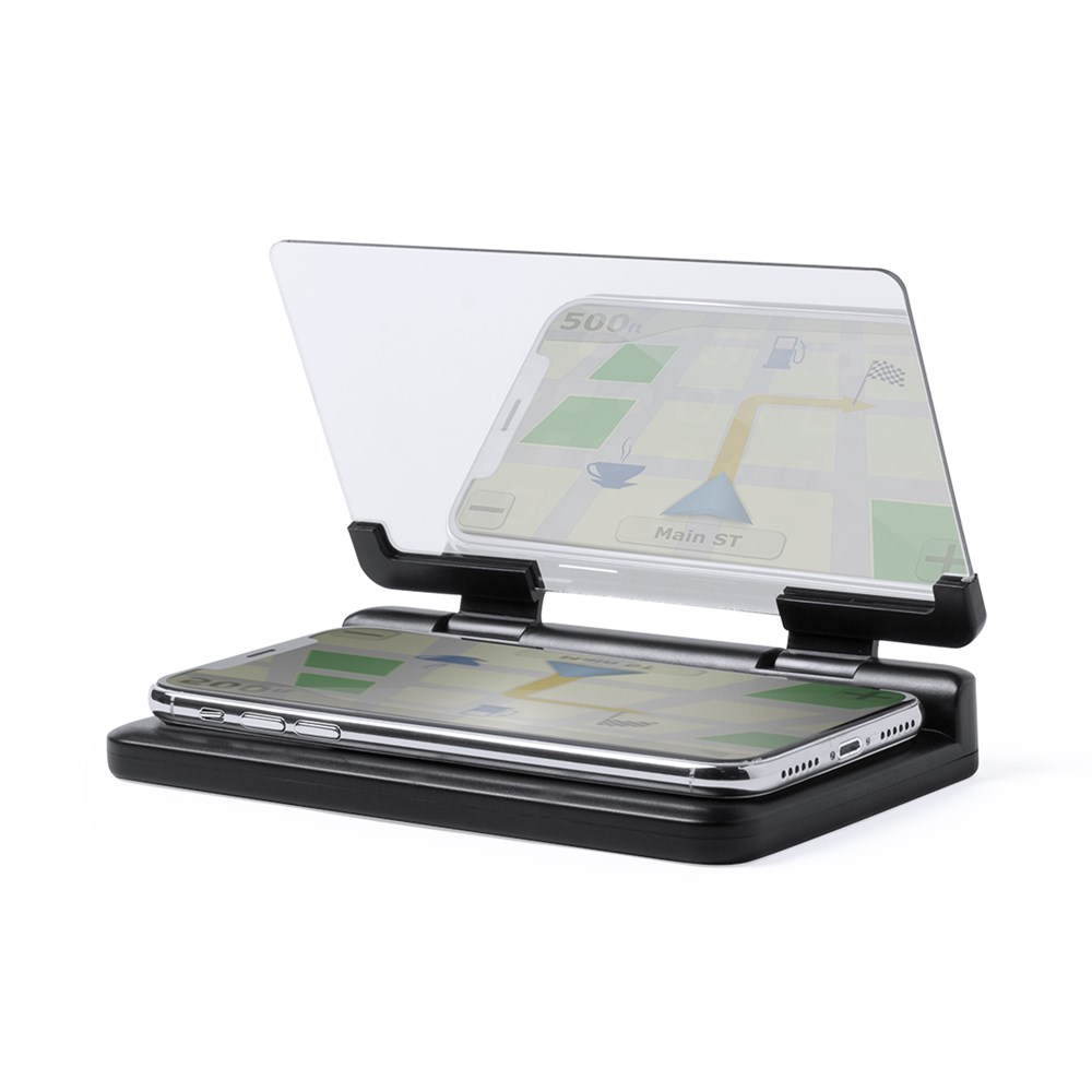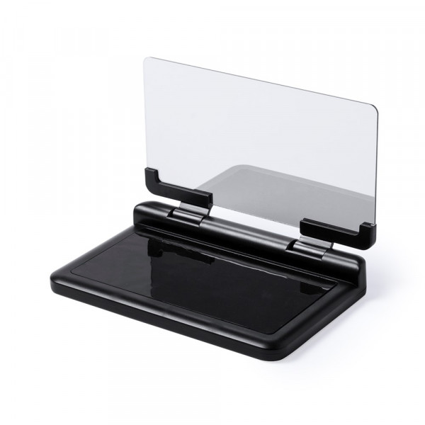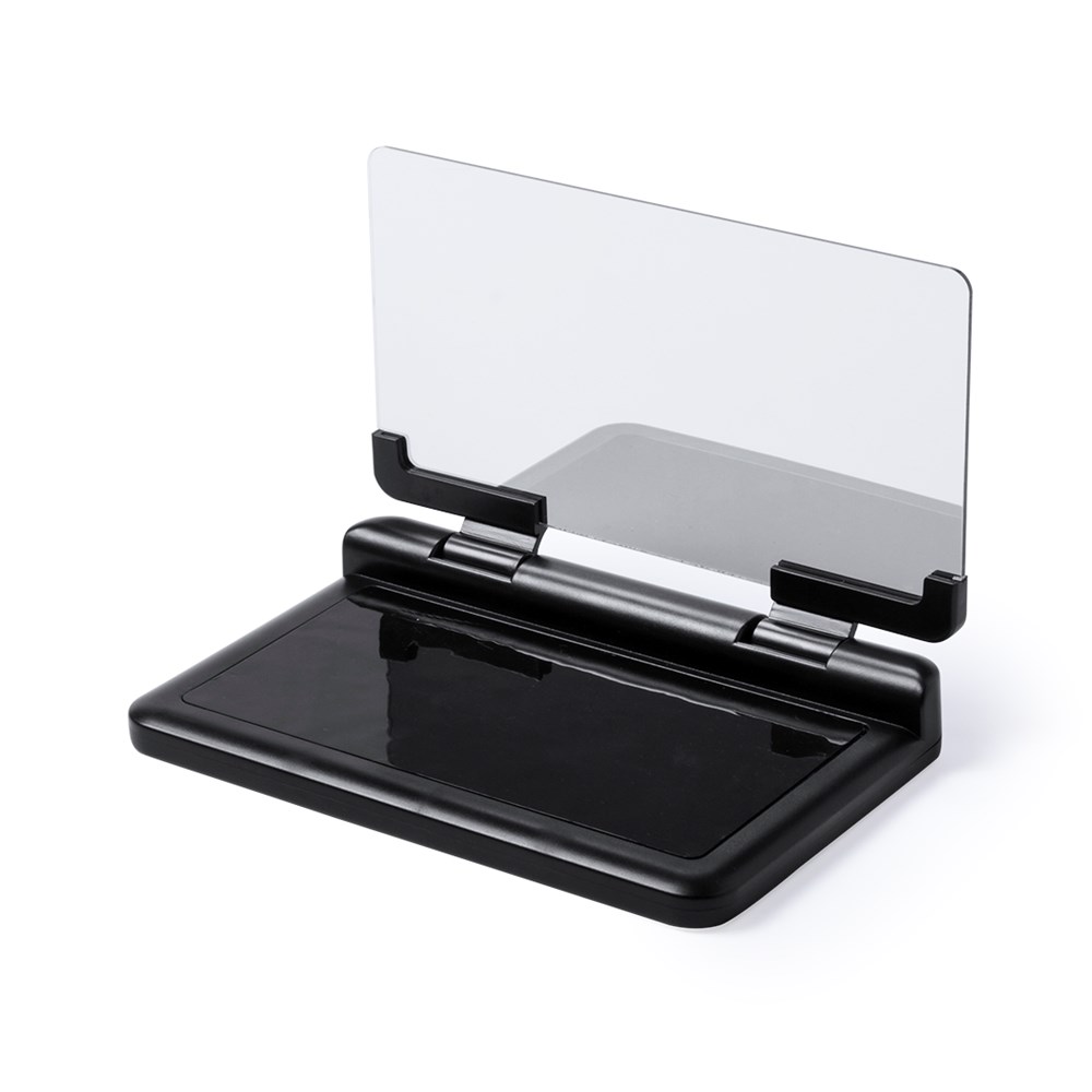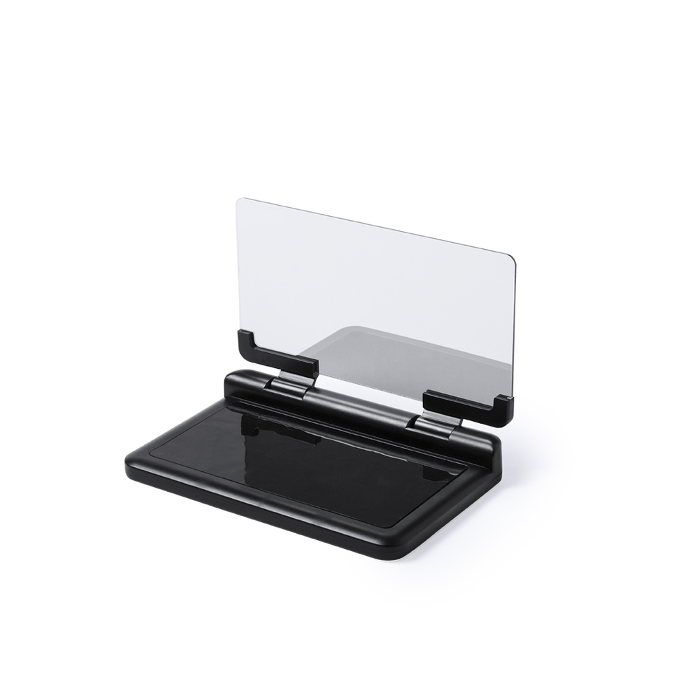 Support screen for automobile. With adjustable mirror image doubler and ultra-adhesive non-slip surface for dashboard and smartphone. Presented in an attractive design box.