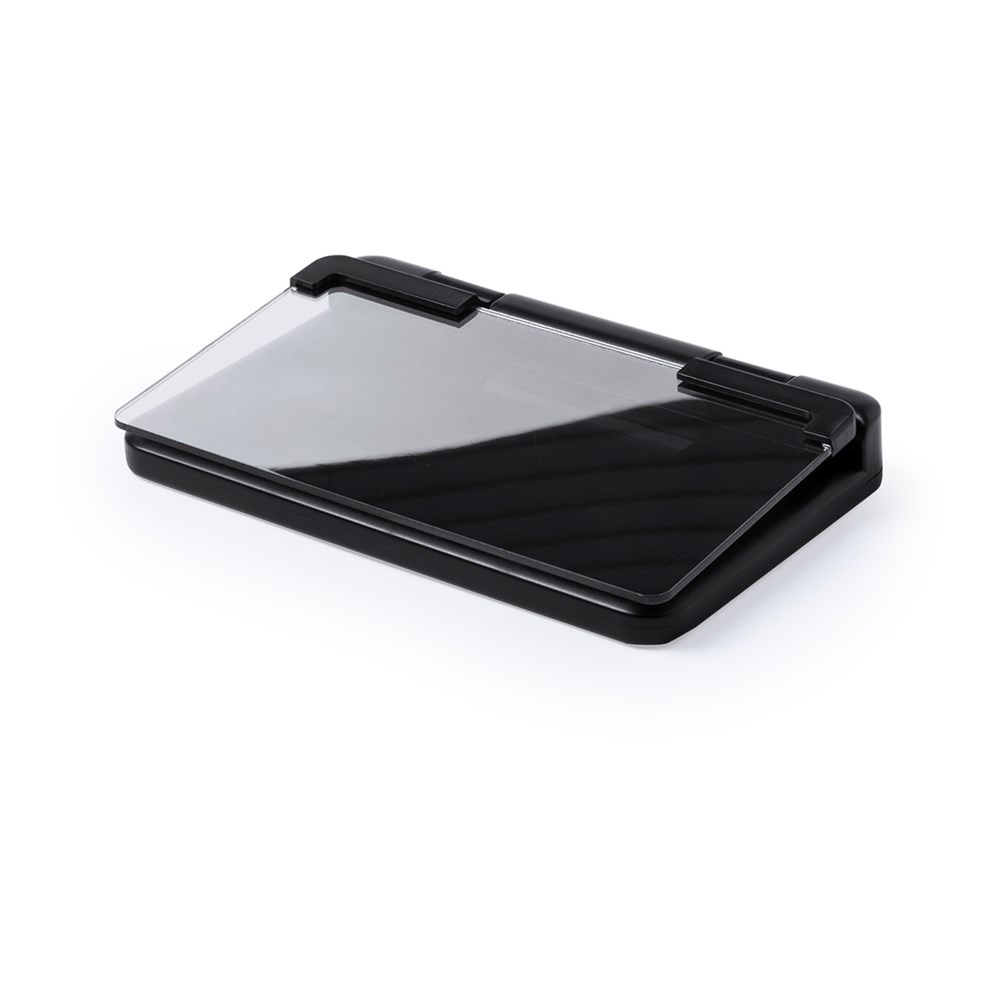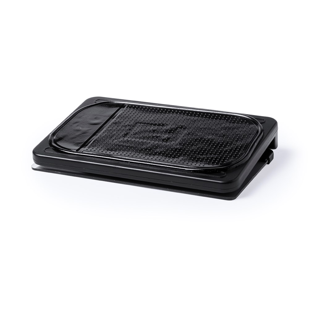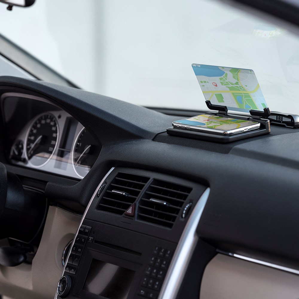 Support screen for automobile. With adjustable mirror image doubler and ultra-adhesive non-slip surface for dashboard and smartphone. Presented in an attractive design box.
