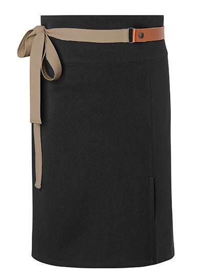 Twill weave, 215 g/m² | Colourfast, easy-care, sustainable | Modern, comfortable half apron that perfectly combines sustainability and style | Polyester content made from recycled plastic | Urban-look waist ties made of real leather and contrasting ties | Contrasting natural-look straps | All belts can be easily removed or attached using press studs | Two patch pockets (18 x 20 cm) on the sides | Slit for enhanced range of motion