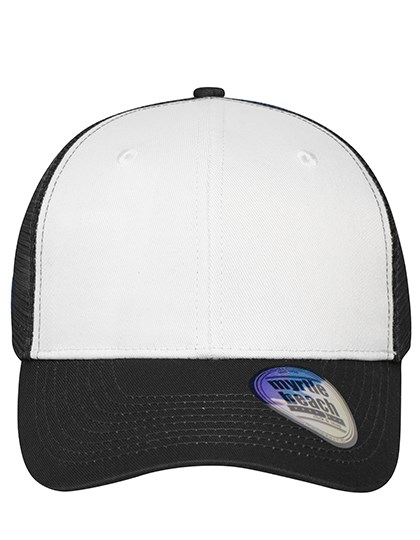Trendy 6 panel mesh cap made of polycotton | 8 decorative seams on the visor | 2 embroidered ventilation holes on the front panels | Lined sweat band | Size-adjustment by 'click & snap' fastener | Front panel: laminated