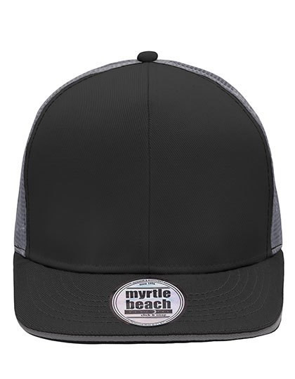 Stylish 6 panel mesh cap with sandwich | "High Profile" shape | Flat peak with sticker and 6 decorative stitching lines | Front panels laminated | Pleasant to wear due to padded sweatband | Size-adjustment by 'click & snap' fastener