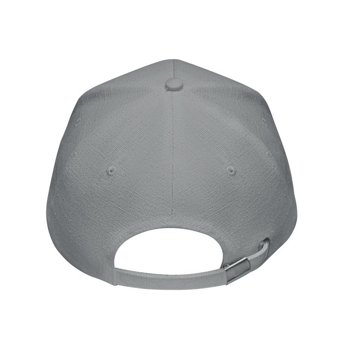 5 panel baseball cap in 100% hemp fabric 370 gr/m² with brass clips on adjustable strap closure. 5 stitched eyelets in matching colour. Size 7 1/4.