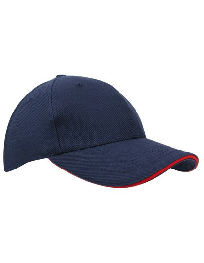 6-panel cap | Structured cotton | Front reinforcement | Adjustable with metal buckle | Sandwich on visor | Decorative stitching