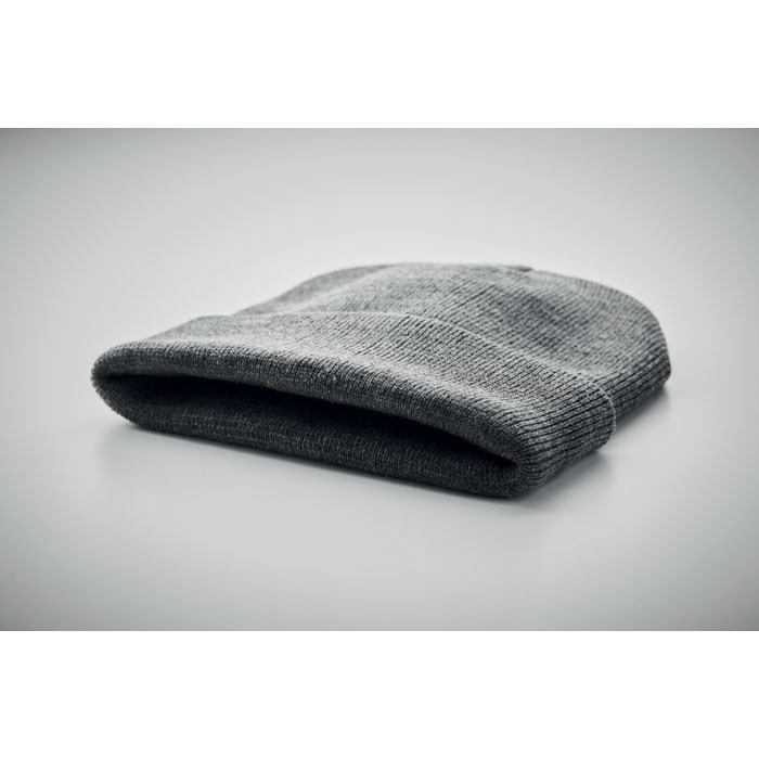 Unisex knitted Beanie hat in soft stretchable RPET polyester with rolled up cuff.